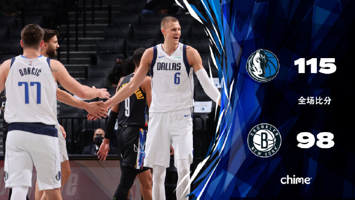 独行侠(16-16):东契奇27分6篮板7助攻2抢断,波尔津吉斯18分4篮板2助攻3封盖,芬尼-史密斯12分8篮板4助攻,理查德森11分2篮板3助攻,布伦森14分3篮板,小哈达威13分3篮板。