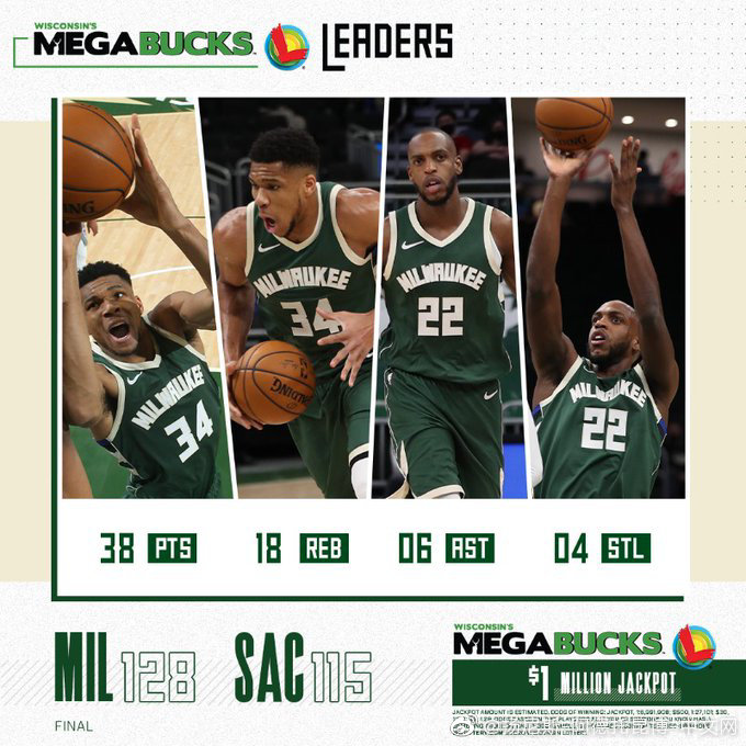 雄鹿(18-13):字母哥38分18板4助、米德尔顿32分8板6助4断2帽、迪文岑佐16分3助、大洛佩兹6分8板、奥古斯丁4分5助2断、康诺顿12分6板2助、福克斯10分2助、波蒂斯8分8板、字母哥哥2分4板。