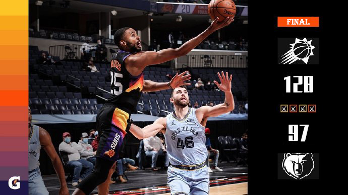24直播网2月21日讯 NBA常规赛太阳对阵灰熊,灰熊近来状态不错取得2连胜。开场后两队进入状态都比较慢,不过太阳逐渐在外线找到手感依靠一阵三分雨取得领先。第二节灰熊手感仍旧平平,但是太阳外线多次三分雨下不断拉大分差,上半场打完,太阳65-34遥遥领先。下半场回来虽然灰熊在进攻端找到手感,但太阳手感火热仍旧不断拿分,灰熊完全无法限制太阳缩小分差,最终太阳128-97大胜灰熊。