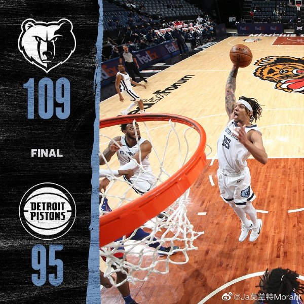 灰熊:莫兰特29分3板4助,瓦兰丘纳斯17分15板,安德森16分6板,克拉克12分7板,阿伦4分6助,贝恩10分5板,蒂尔曼8分8板,琼斯8分1助,梅尔顿5分3板
