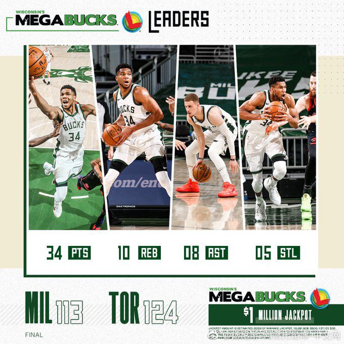 雄鹿(16-12):字母哥34分10篮板8助攻5抢断2盖帽,米德尔顿11分7篮板,迪文岑佐12分3篮板8助攻,福布斯11分2篮板,大洛佩兹9分5篮板,波蒂斯16分6篮板2助攻,康诺顿20分5篮板,奥古斯丁2篮板6助攻