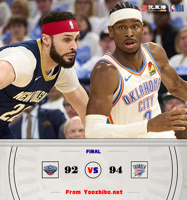 24直播网4月22日讯 西部排名第一的雷霆今日坐镇主场迎来和鹈鹕的系列赛G1之争,鹈鹕凭借附加赛击败国王的胜利搭上季后赛末班车,本场比赛锡安因伤缺阵。首节之争双方打得都比较谨慎,作为两支擅长进攻的球队但单节都只拿到17分,雷霆方面整体进攻集中在亚历山大,不过内线新人霍姆格伦发挥有些失常首节7投1中没能提供太大帮助;鹈鹕这边在第二节初依靠三记三分短暂确立起7分领先,但这些优势很快就在拉锯战中被蚕食殆尽,双方以平手形式结束上半场。休息归来雷霆在节中送出11-0的攻势拿到9分领先,虽然很快就被鹈鹕反扑抹掉,但他们很快送出第二波17-6的跨节攻势一举确立起10分领先;顽强的鹈鹕随后靠着两记三分止血,末段又连抓对手失误扭转局势。不过决胜时刻鹈鹕连着拼下三个进攻篮板都没能转化成得分,同时麦科勒姆最后的三分绝杀也没能打成,而雷霆这边亚历山大站出来连中两记高难度进球拿下5分为雷霆反超奠定胜局。最终,雷霆主场力克鹈鹕拿下开门红。