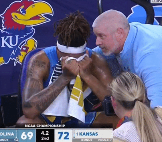 下半场最后38.5秒,北卡的巴考特伤退,他下场之后流泪,半决赛对阵杜克,他就受伤了,如今在总决赛受伤,球队丢了冠军。