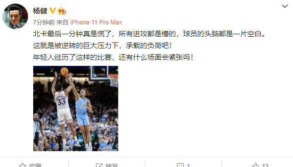 知名篮球人杨健赛后谈到了最后时刻的惊心动魄,他表示:北卡最后一分钟真是慌了,所有进攻都是懵的,球员的头脑都是一片空白。这就是被逆转的巨大压力下,承载的负荷吧!年轻人经历了这样的比赛,还有什么场面会紧张吗!