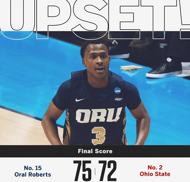 全美15号种子Oral Roberts奥罗罗伯茨大学加时爆大冷击败全美2号种子俄亥俄州立大学,仅0.035%预测正确此轮结果。