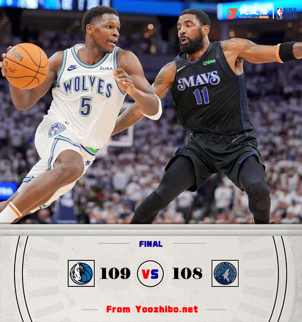 24直播网 5月25日讯 NBA西部决赛G2,森林狼主场再战独行侠。目前大比分森林狼0-1落后。比赛开始,双方开场便陷入缠斗,比分交替领先,森林狼不断冲击内线拿分,独行侠内外开花给出回应,里德手感火热连中三分,森林狼持续发力获得两位数优势,东契奇得分助攻一肩挑带队追赶,半场战罢森林狼60-48领先12分。易边再战,森林狼命中率下降,东契奇高效输出带队不断蚕食分差,末节欧文三分反超,此后双方争夺陷入白热化,关键时刻爱德华兹连投带罚拿到6分但出现关键失误,东契奇三分准绝杀,里德三分反绝杀不中,最终,独行侠109-108再胜森林狼,总比分2-0领先。