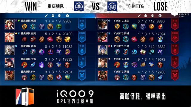 开局广州TTG公孙离中路抢线。2分15秒广州TTG拿下暴君。3分16秒野区团战广州TTG打出1换3。3分58秒重庆狼队发育路击杀不知火舞。6分14秒广州TTG野区击杀澜。7分20秒广州TTG对抗路击杀沈梦溪并摧毁对抗路二塔。8分35秒野区团战广州TTG打出0换2。8分49秒广州TTG摧毁敌方对抗路高地塔。11分58秒中路团战广州TTG打出0换2并摧毁中路二塔。12分34秒广州TTG摧毁敌方水晶拿下比赛。