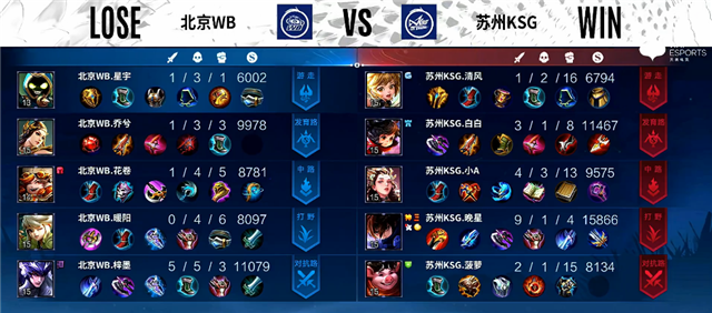 2分45秒公孙离拿下暴君。5分30秒鲁班七号推掉下路一塔。6分15秒上路团战,北京WB打出0换4,吕布拿下一血,澜拿下三杀。7分钟澜拿下主宰。8分钟镜拿下暴君。9分10秒中路团战,北京WB打出2换4并推掉中路一塔。10分57秒澜拿下主宰。11分20秒上路团战,北京WB打出0换2。12分08秒苏州KSG上路高地塔被破。13分钟澜拿下暴君。14分50秒澜拿下主宰。16分40秒鲁班七号推掉中路一塔,镜拿下暴君。19分30秒高地团战,苏州KSG打出1换4,鲁班七号拿下三杀。20分18秒镜拿下风暴龙王。21分47秒苏州KSG推掉中上两路高地。25分54秒北京WB推掉水晶率先拿下一分。