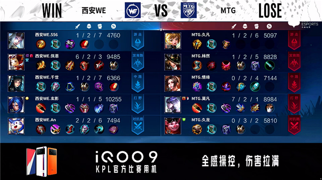 2分40秒,西安WE控下暴君,随后MTG镜击杀梦奇拿下一血。3分07秒,MTG控下先知主宰。3分55秒,中路团,双方1换1,随后MTG破掉西安WE上一塔。5分45秒,中路团,双方再次1换1。7分04秒,MTG控下暴君。7分24秒,西安WE控下先知主宰,随后团战西安WE打出2换3。7分58秒,西安WE破掉MTG中一塔。10分01秒,西安WE鲁班七号击杀猪八戒。10分29秒,西安WE控下暗影主宰。11分30秒,西安WE破掉MTG中二塔,随后团战西安WE打出0换2。11分55秒,西安WE破掉MTG中高地及下二塔。12分12秒,西安WE破掉MTG下高地。12分26秒,西安WE边团边拆摧毁MTG水晶赢下比赛。