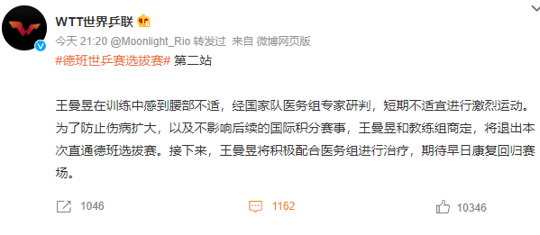 王曼昱官宣的通告显示,“在训练中感到腰部不适,经国家队医务组专家研判,短期不适宜进行激烈运动”。也就是说在近期的训练中,王曼昱腰部受伤,所以无奈退赛,但很快就有球迷深挖,发现在新加坡大满贯结束的时候,身兼三项的王曼昱就已经受伤比较严重了。