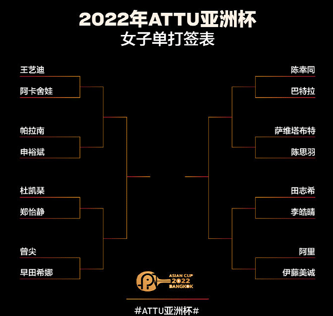 如今亚洲杯的抽签结果已经出炉,女单的王艺迪和早田希娜在同一个半区,陈幸同和伊藤美诚在下半区,4人都是种子选手。女单1/8决赛对阵:王艺迪VS阿卡舍娃、陈幸同VS巴特拉;