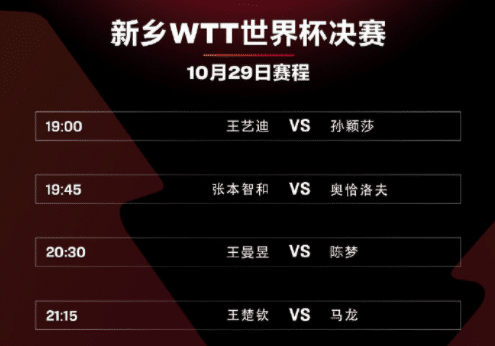 来源:24直播网10-29 16:2624直播网10月29日,新乡WTT世界杯决赛的单打半决赛将会在今天晚上开战,对阵:王艺迪大战孙颖莎、张本智和迎战奥恰洛夫、王曼昱死磕陈梦、王楚钦对决马龙,比赛从晚上7点开始,赛制也发生变化,从前两轮的5局3胜升级为7局4胜。