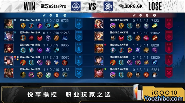 开局双方正常抢线。1分53秒发育路武汉eStarPro击杀公孙离,拿下一血。2分07秒武汉eStarPro拿下主宰,佛山DRG.GK拿下暴君。2分28秒对抗路武汉eStarPro击杀嬴政,打出0换1。3分26秒发育路武汉eStarPro击杀刘邦,打出0换1。4分39秒对抗路武汉eStarPro击杀刘邦,摧毁敌方发育路外塔、对抗路外塔。6分04秒中路武汉eStarPro击杀嬴政,佛山DRG.GK摧毁敌方对抗路外塔,武汉eStarPro拿下暴君。6分53秒河道武汉eStarPro击杀夏侯惇,摧毁敌方中路外塔。7分58秒武汉eStarPro摧毁敌方发育路二塔,曜二连击破,打出1换4,摧毁敌方发育路高地,摧毁水晶拿下比赛。
