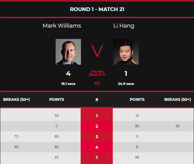 本场比赛第一局,威廉姆斯尽管状态一般,但李行进入状态较慢,“金左手”通过几次上手,59-19先胜一局,1-0开门红。第二局,李行经过上一局适应,在这一局找到进攻手感,他打出单杆85分,并以85-0零封威廉姆斯,1-1追平比分。