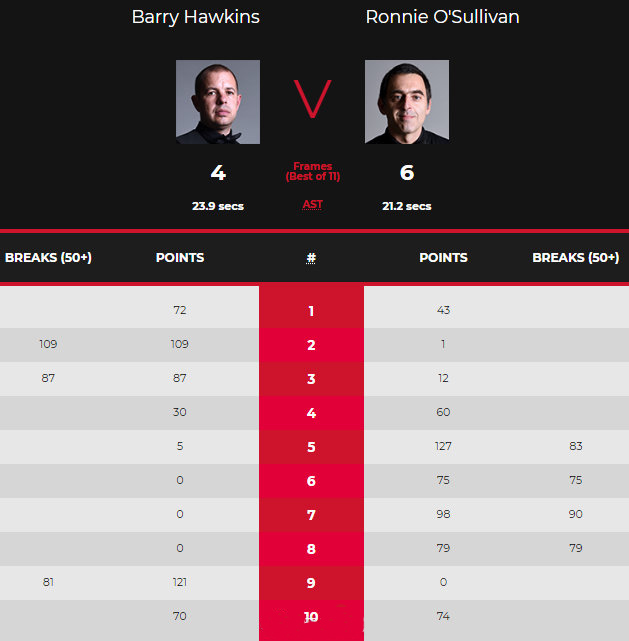 本场比赛,奥沙利文开局明显慢热,而霍金斯则进入状态较快。比赛第一局,奥沙利文进入状态较慢,霍金斯在拉锯战中72-43胜出,1-0开门红。第二局,霍金斯轰出单杆109分,109-1赢下,比分扳成2-0。