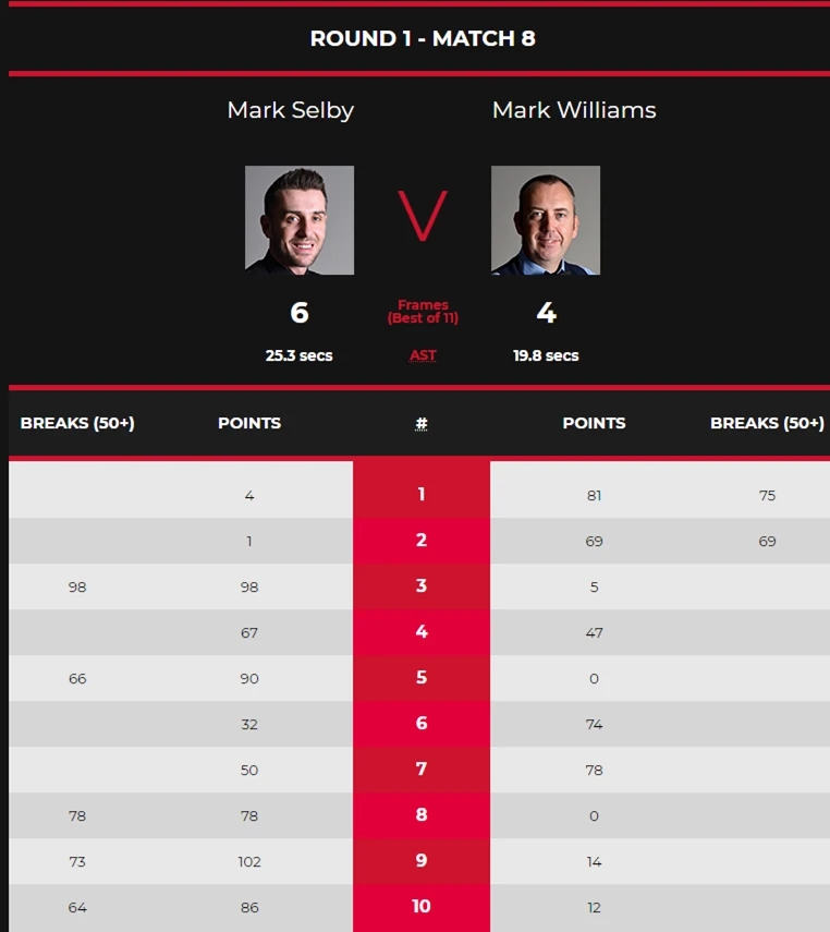 本场比赛,第一局,威廉姆斯很快进入状态,他打出单杆75分,81-4先胜一局,1-0领先。第二局,威廉姆斯又打出单杆69分,69-1轻松获胜,2-0扩大优势。