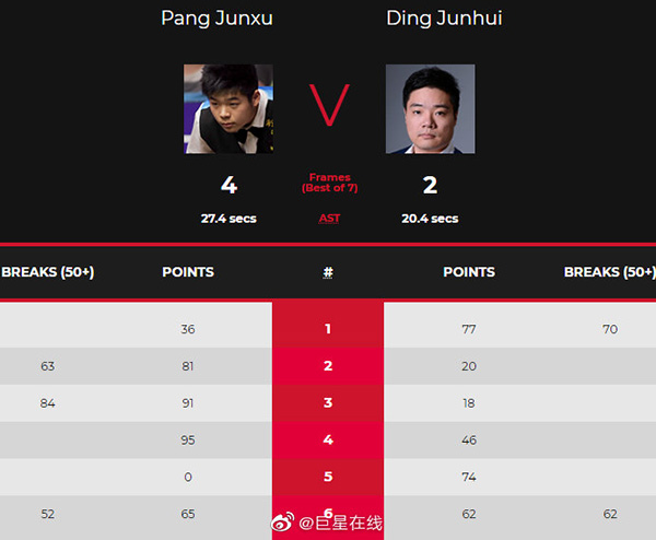 第三局,庞俊旭的状态越来越好,丁俊晖频频失误给了小将机会。双方多次上手后,庞俊旭单杆轰出84分,以91-18再胜一局,总比分2-1反超丁俊晖。第四局,开局阶段,庞俊旭解球连续被罚分,之后,他反做斯诺克,丁俊晖解球送大礼,庞俊旭95-46单局逆转,比分优势扩大到3-1,并赢得本场比赛的赛点。