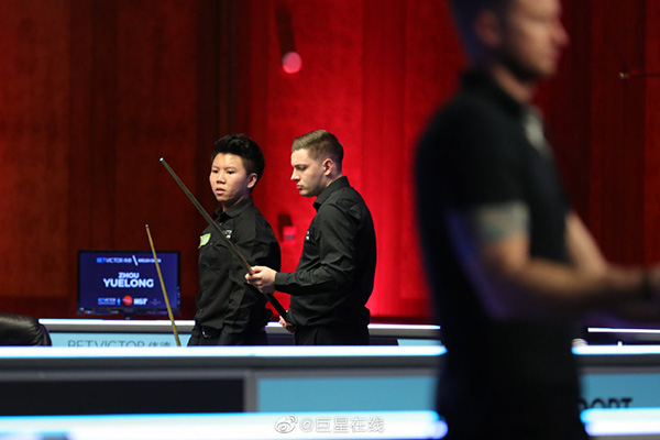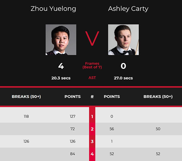 第一局周跃龙迅速进入状态,轰出了单杆118分、127-0零封了卡蒂,取得了1-0的领先。第二局,卡蒂虽然打出了单杆50分、合计才56分,周跃龙通过多杆上手,72-56有惊无险拿下,2-0。