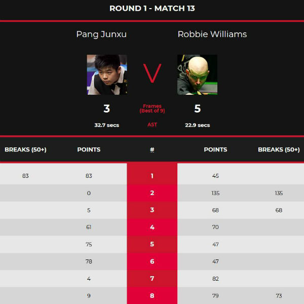 首局比赛中,威廉姆斯率先获得围球上手机会,进攻断断续续中断在45分,此后庞俊旭毫不手软完成一杆83分超分制胜1-0领先。第2局中威廉姆斯进攻端打出高水平,上手完成单杆135分大号破百,也是目前为止赛会单杆最高分,第3局中威廉姆斯在乱局中不断吃进分数,单杆68分超分拿下这局,总分2-1反超。第4局两人陷入反复缠斗,在彩球阶段庞俊旭拼球失误,威廉姆斯清台70-61拿下这局,总分来到3-1领先。