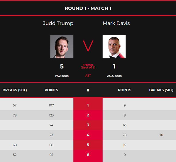 第一局,马克-戴维斯5分摔袋,特鲁姆普两次上手机会,单杆46分单杆57分犯规,特鲁姆普107-9拿下第一局。第二局,特鲁姆普三次上手机会,单杆20分单杆25分单杆78分,以123-8拿下第二局。特鲁姆普2-0领先。第三局,特鲁姆普没有解到留下机会,马克-戴维斯单杆46分,特鲁姆普单杆46分;马克-戴维斯单杆13分,晕进黄球结果做住了绿球,马克-戴维斯解到黑球,还形成自由球;特鲁姆普单杆21分,特鲁姆普74-63拿下第三局。特鲁姆普3-0。