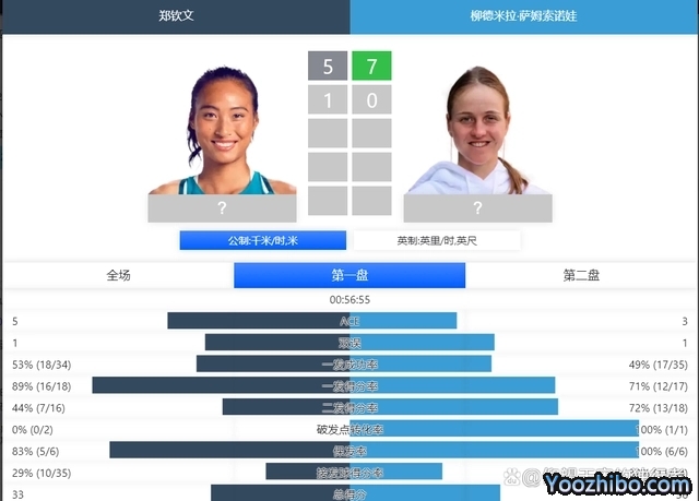 第一盘比赛,郑钦文错失5-4(30-0)的领先,并在第11局关键时刻出现了双误,被对手破发。掌握主动权的萨姆索诺娃随即在自己发球胜盘局中平稳保发,从而以7-5先赢一盘。