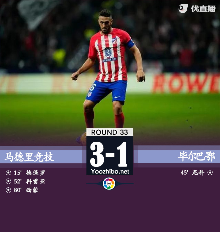 24直播网讯:北京时间4月28日03:00,西甲第33轮马竞迎战毕尔巴鄂的比赛,上半场德保罗凌空抽射破门,格列兹曼回传失误,尼科威廉姆斯推射扳平比分,下半场科克助攻科雷亚单刀反超比分,利诺爆射扩大比分,最终马竞3-1毕尔巴鄂领先第五名6分。