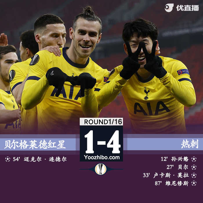 24直播网2月19日讯 北京时间2月19日01:55,欧联杯1/16决赛首回合,沃尔夫斯贝格迎战热刺。上半场,孙兴慜头球首开记录,贝尔传射,小卢卡斯一条龙破门,热刺半场3-0领先沃尔夫斯贝格。下半场,西索科送点,维尼修斯破门。最终,热刺4-1战胜沃尔夫斯贝格。