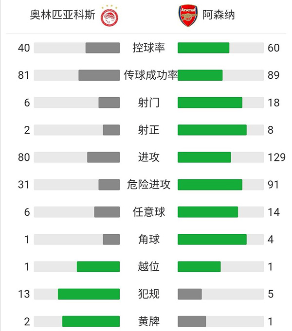 全场比赛结束,阿森纳客场3-1战胜奥林匹亚科斯。