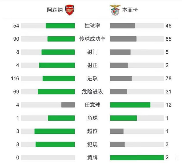 全场比赛结束,阿森纳3-2本菲卡。