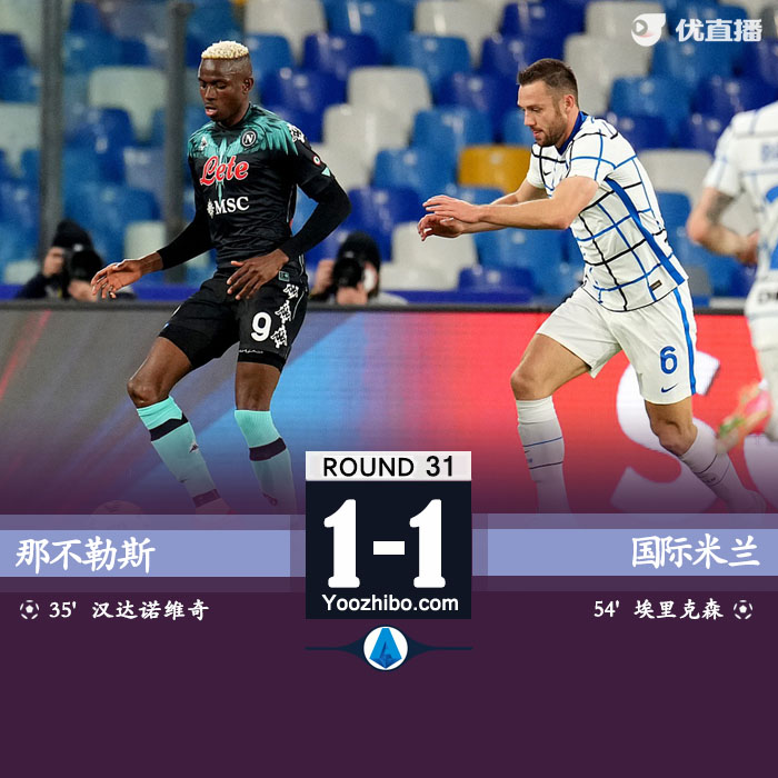 24直播网4月19日讯 北京时间4月19日凌晨2点45分,2020-21赛季意甲第31轮焦点战在马拉多纳球场展开角逐,那不勒斯坐镇主场迎战国际米兰。上半场卢卡库两次中框,汉达诺维奇乌龙球,下半场埃里克森远射扳平,波利塔诺中框。最终国际米兰客场1-1战平那不勒斯,国米联赛11连胜遭终结。积分榜方面,国米积75分以9分优势领跑,那不勒斯积60分位居第5名。