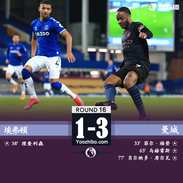 24直播网2月18日讯 北京时间2月18日凌晨4:15,英超联赛第16轮一场补赛打响,曼城做客挑战埃弗顿。上半场,米纳受伤离场,福登先拔头筹,理查利森扳平比分。下半场,马赫雷斯世界波破门,B席远射再下一城。全场比赛结束,曼城3-1力克埃弗顿,各项赛事豪取17连胜。