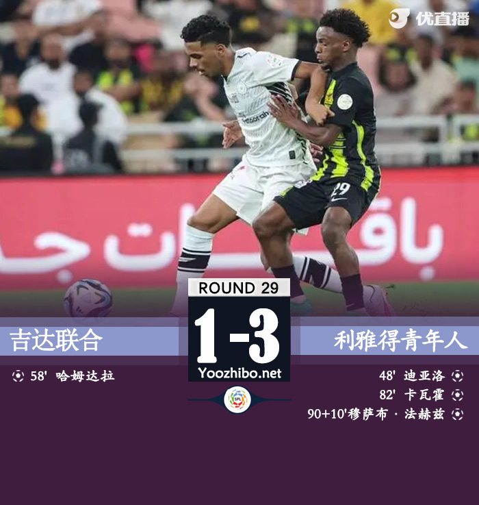 24直播网讯:北京时间4月27日凌晨2时,沙特联第29轮,吉达联合主场迎战利雅得青年人,上半场,双方都未能把握住进球机会,互交白卷。半场战罢,吉达联合暂0-0利雅得青年人;下半场,卡拉斯科助攻迪亚洛破门,哈姆达头球破门扳平比分,替补登场的卡洛斯破门再次为利亚得青年人取得领先,补时最后时刻,阿尔朱维尔再入一球锁定胜局。全场比赛结束,吉达联合1-3利雅得青年人。