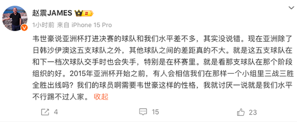 来源:24直播网03-01 13:3324直播网3月1日讯,知名媒体人赵震在社交账号上更新动态,发文声援当红国脚韦世豪此前接受采访时的争议言论。赵震直言,除了日韩沙伊澳这5队,亚洲其他球队实力确实差不多。