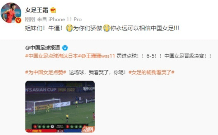 王霜写道:“姐妹们!牛逼!为你们骄傲!你永远可以相信中国女足!”