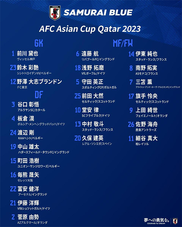日本公布亚洲杯名单:20人留洋欧洲联赛!三笘薫带伤入围,3名将落选