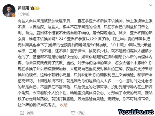 黄健翔写道:“有些人自从国足被新加坡逼平后,一直在拿亚洲杯后该不该换帅,谁主张换谁主张不换,来搞拉踩。这些人,根本不在乎国足的成绩,只在乎自己的利益和口舌之利。