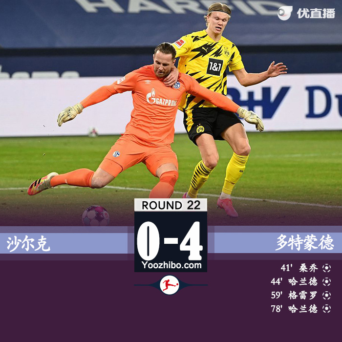 24直播网2月21日讯 北京时间2月21日01:30,德甲第22轮鲁尔区德比展开争夺,多特蒙德客场挑战沙尔克。上半场,桑乔利用对方后场失误劲射先下一城,随后助攻哈兰德侧钩扩大比分。下半场,罗伊斯助攻格雷罗推射破门,贝林厄姆助攻哈兰德完成梅开二度。最终,多特蒙德4-0客场大胜沙尔克全取3分,仍居第6位。