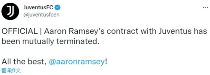 来源:24直播网07-27 10:2524直播网07月27日讯 据尤文图斯官方消息,俱乐部已与拉姆塞提前解约,这位威尔士国脚现在已成为自由球员。