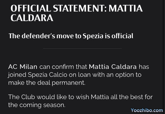24直播网07月18日讯 AC米兰官方消息,球队后卫卡尔达拉租借加盟斯佩齐亚,租期一年。