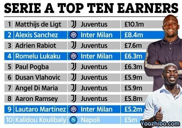 你的位置: 24直播网 足球直播 意甲 意甲薪水排名:前十尤文占六,卢卡库桑切斯上榜