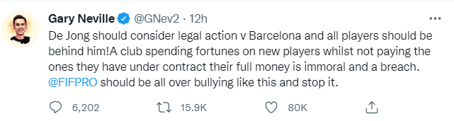 内维尔对此表示:“德容应该考虑对巴萨采取法律行动,所有球员都会支持他。一支斥巨资引援的俱乐部竟然不按合同支付球员薪水,这是不道德也是违规的做法,国际职业足球运动员工会应该制止这种行为。”