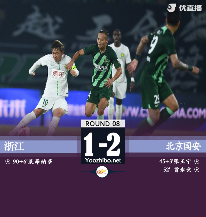 24直播网讯:北京时间4月26日19点35分,中超第8轮浙江主场迎战北京国安。上半场浙江攻势占优,奥苏乌射中立柱,补时阶段张玉宁破门,下半场,曹永竞扩大优势,莱昂纳多造点但自己主罚的点球被侯森扑出,随后他在补时阶段扳回一球。全场比赛结束,北京国安2-1浙江。